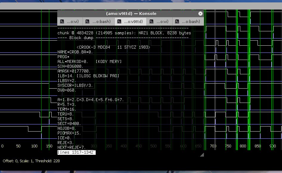 To convert the signal data into actual files that were stored on a magnetic tape, custom software was needed. Second phase of the restoration process brought to life a software called “Nine Track Lab” – graphical tool that allows not only decoding NRZ1-encoded data, but also fixing problems related to tape age or drive’s read inaccuracies.
